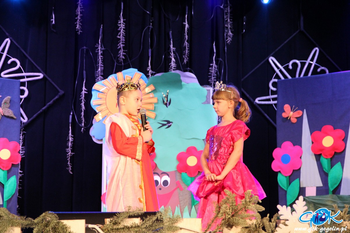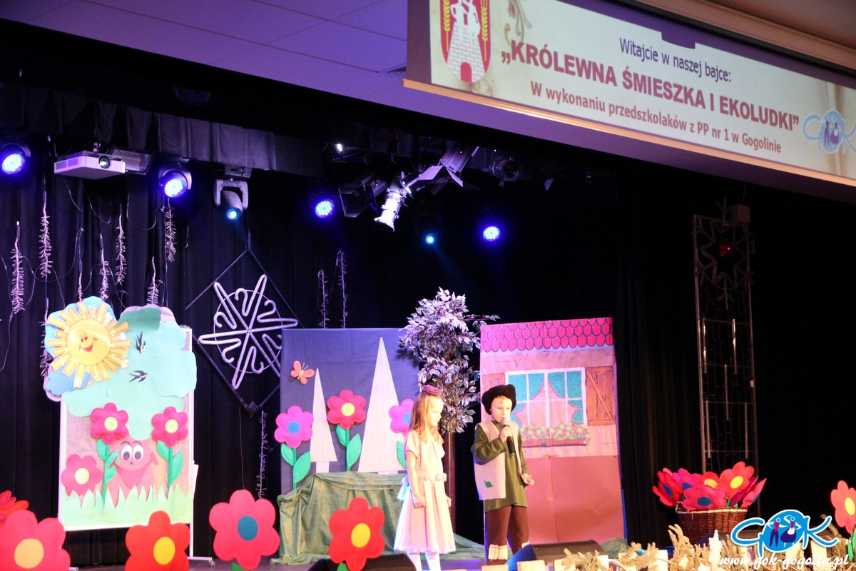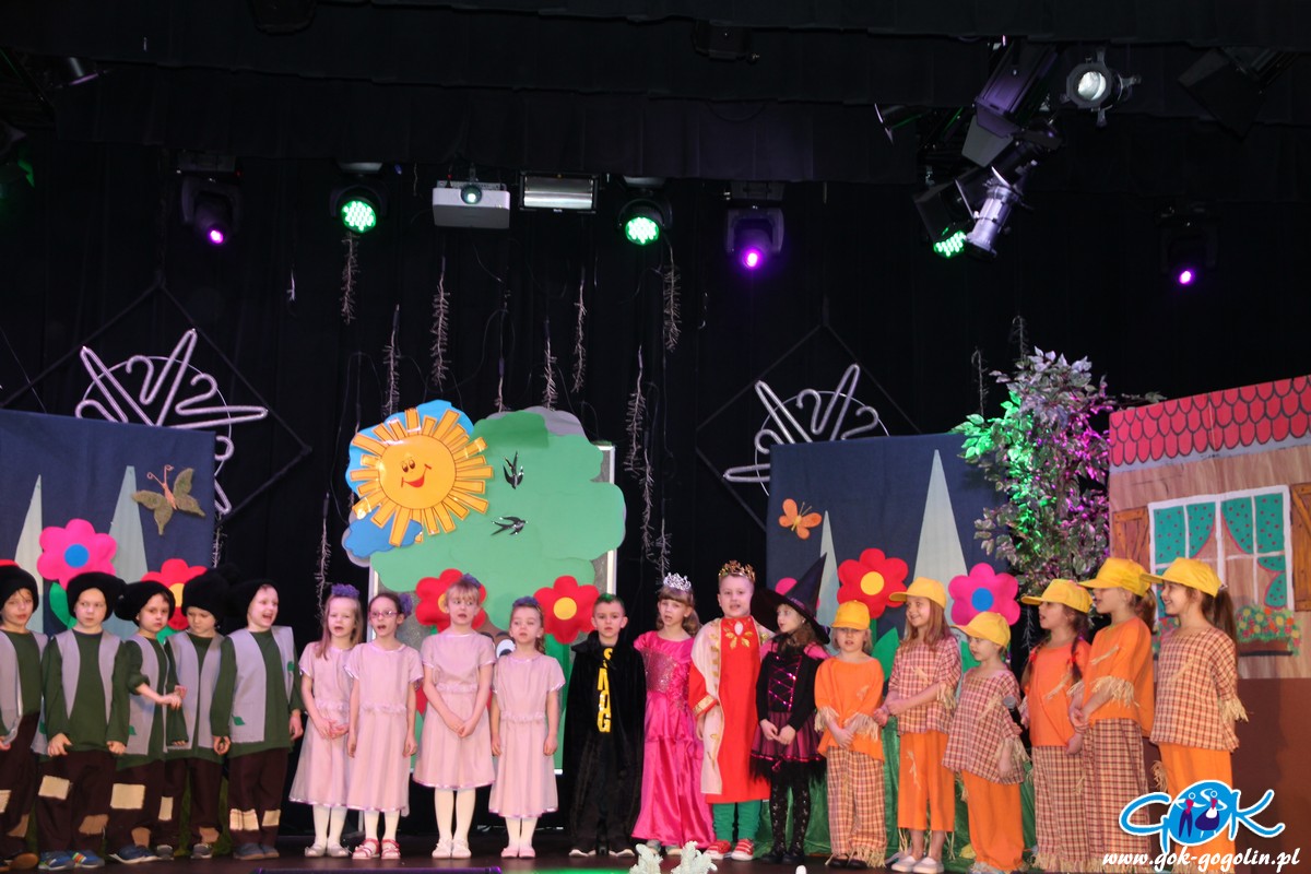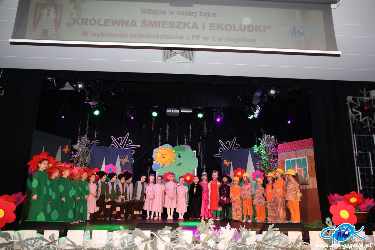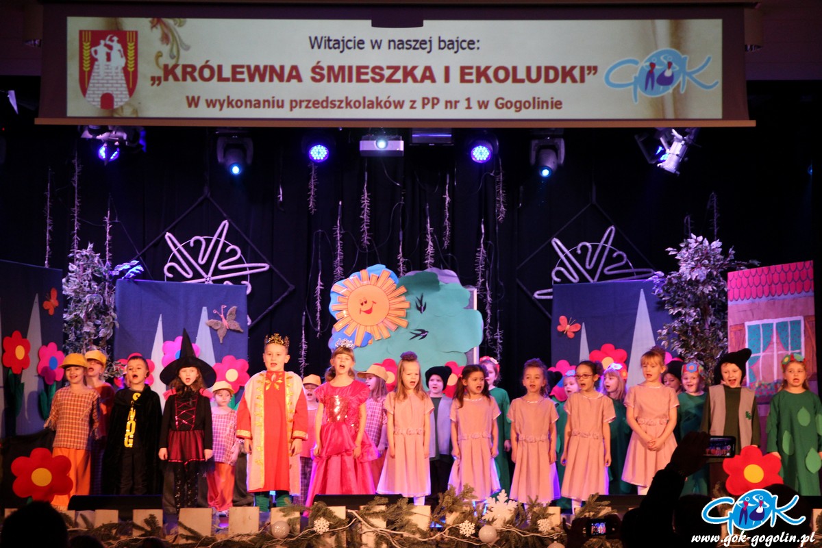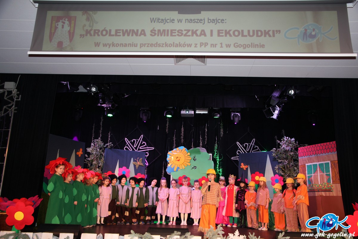 W sobotę 23.02.2019 r. w Gminnym Centrum Kultury odbyła się pierwsza w tym roku bajka z cyklu "Witajcie w naszej bajce". Publiczność miała okazję zobaczyć wspaniałe widowisko w wykonaniu grupy Krasnoludków z Publicznego Przedszkola Nr 1 w Gogolinie. Dzieci zaprezentowały bajkę pt:" Królewna Śmieszka i Ekoludki". Wspaniałe stroje, scenografia oraz świetna gra małych aktorów sprawiły, że bajka ta wypadała znakomicie. Do występu grupę przygotowała pani Barbara Michalik.
