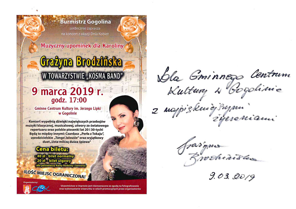 W sobotę 9 marca 2019 r. w Gminnym Centrum Kultury w Gogolinie odbył się koncert z okazji Dnia Kobiet pt. „Muzyczny upominek dla Karoliny”. Gwiazdą wieczoru była Pierwsza Dama Polskiej Sceny Muzycznej, znakomita aktorka i tancerka - Grażyna Brodzińska w towarzystwie Kosma Band.