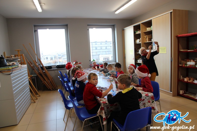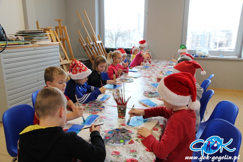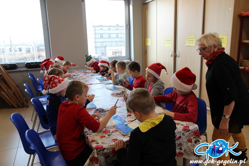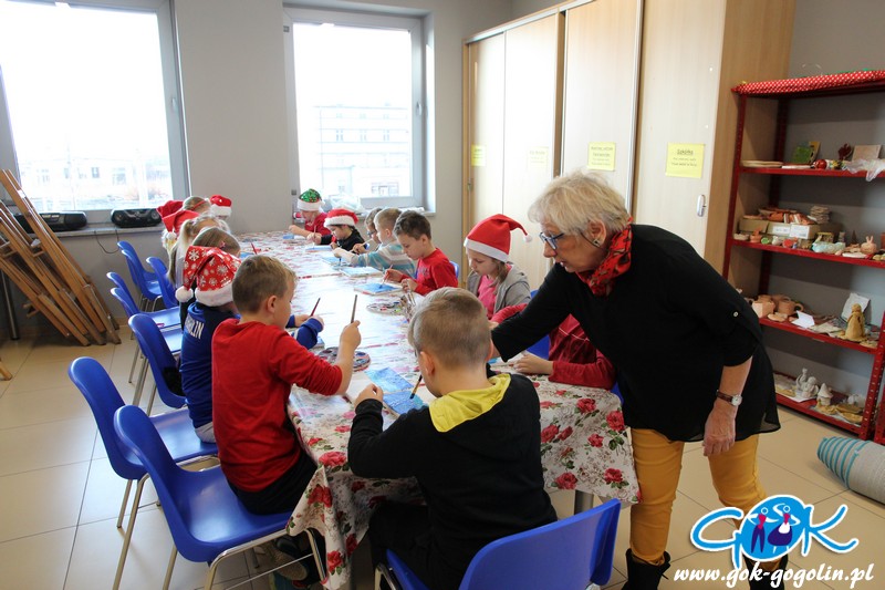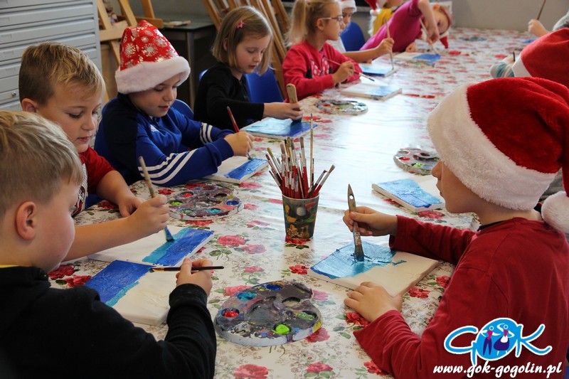 W piątek 6 grudnia 2019 r. w Gminnym Centrum Kultury w Gogolinie odbyły się mikołajkowe warsztaty plastyczne z Panią Dorotą Kłeczek dla uczniów klasy 2a z PSP nr 2 w Gogolinie. Dzieci malowały farbami akrylowymi na prawdziwych podobraziach malarskich.