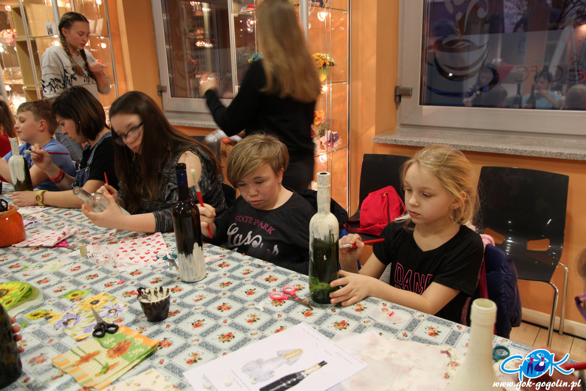 Dnia 05.02.2019r. dzieci i młodzież z Nutki Cafe podczas zajęć krawieckich bawili się ponownie w projektantów tym razem mody ślubnej. Każdy przyniósł pustą butelkę, na której wykonaliśmy ozdobę metoda decoupage. Następnie w parach projektowali suknię ślubną oraz garnitur lub frak dla Pana Młodego. Nie było to proste zadanie, ale dzięki wiedzy i talentowi Aleksandry Wybraniec (uczennicy PSP 2 w Gogolinie, wolontariuszki w Nutka Cafe) zdołaliśmy stworzyć piękne pary. Będziecie je oglądać już nie długo podczas wystawy.