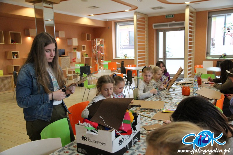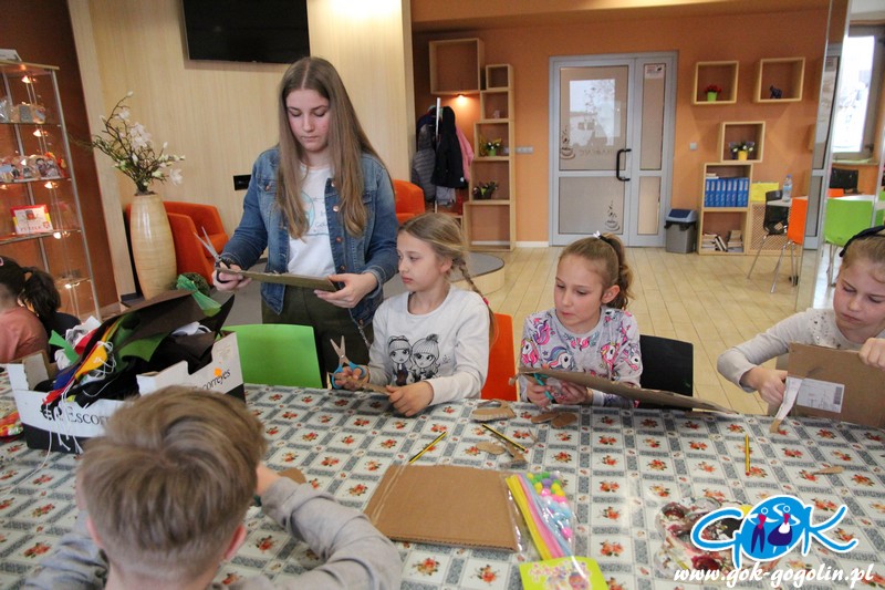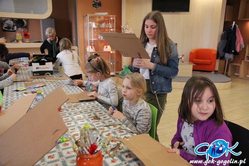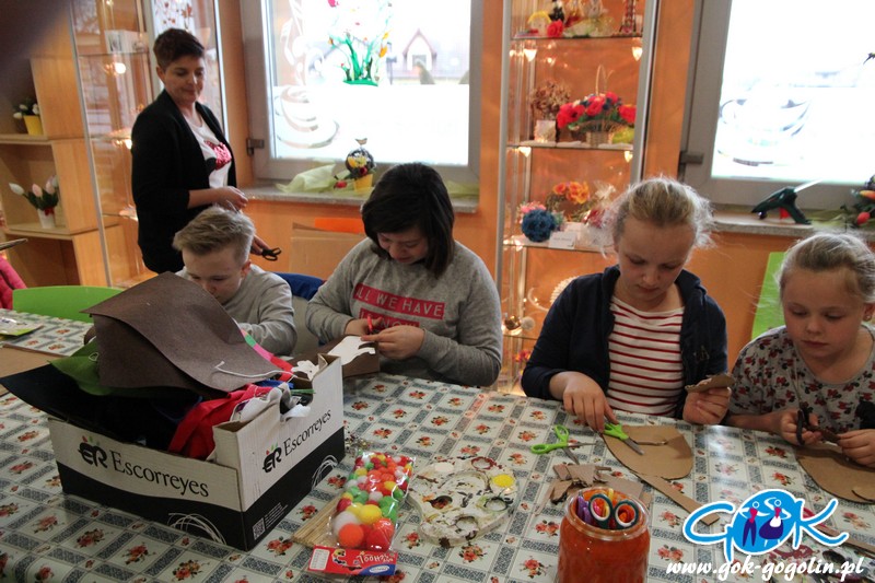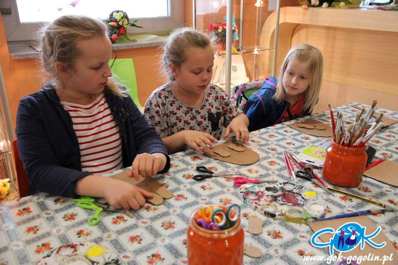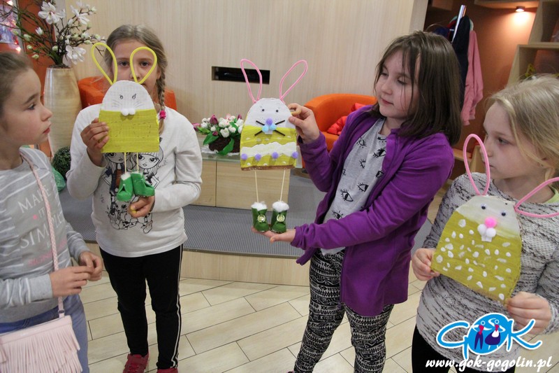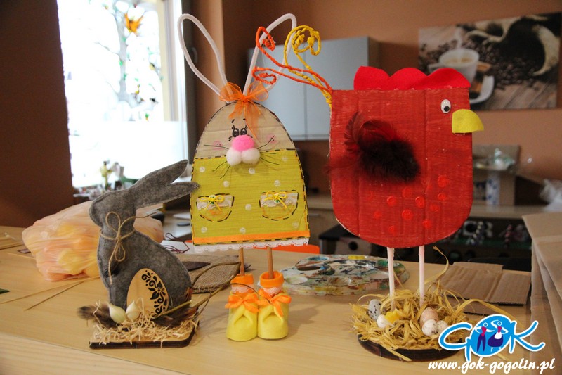 Poprzez odpowiednio wyciętą i pomalowaną tekturę powstał tułów naszego zwierzątka. Całość wykończono ozdobami: guzikami, wstążkami, koronką. Domalowano także wąsy i oczka, doklejono pompony i przymocowano uszy z drucików kreatywnych. Całość wyszła bardzo ciekawie! Największym zaskoczeniem były jednak buty naszego zajączka, które powstały z tektury, jajka niespodzianki oraz filcu. Ten sposób na pewno wykorzystamy jeszcze w niejednej pracy. Na zajęciach powstały także inne dekoracje: był kogucik oraz ozdoba wielkanocna z uszytym z filcu zajączkiem.