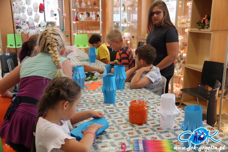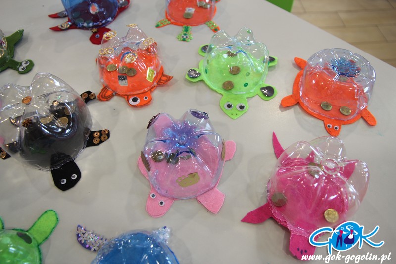 Na zajęciach plastycznych dzieci miały możliwość wykonania kolorowych pomponów, które przerobione zostały w wesołe stworki. Dołączony sznurek pozwolił na mnóstwo zabawy. Wykonane zostały także ozdoby związane z morzem: skarbonki w kształcie żółwika oraz papierowe akwaria.