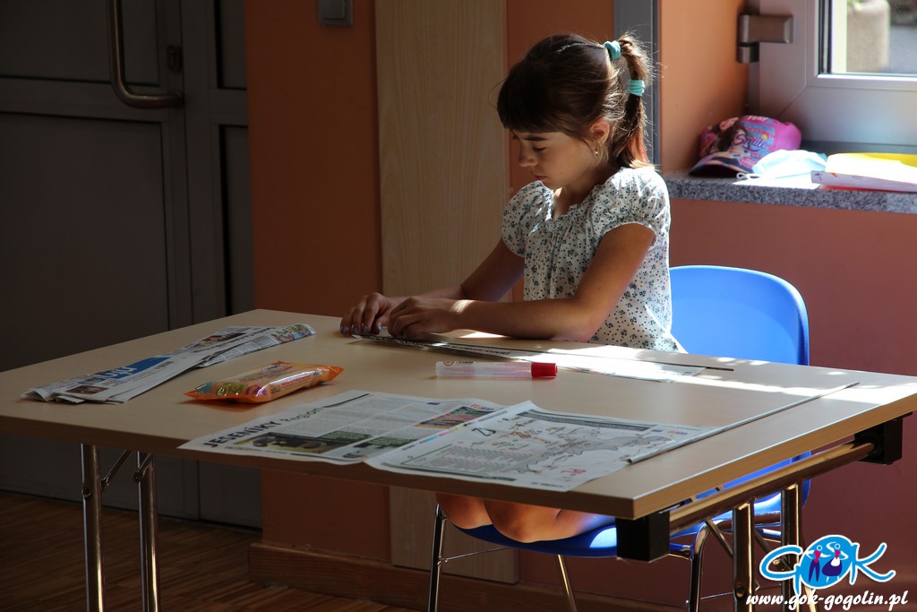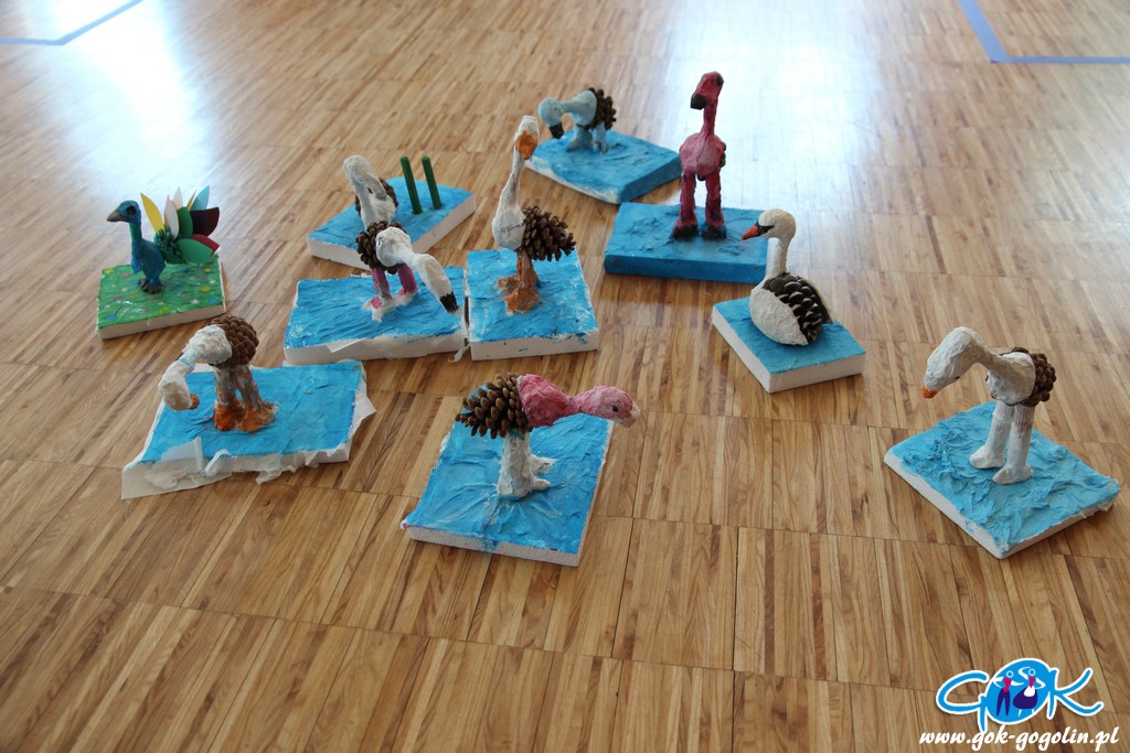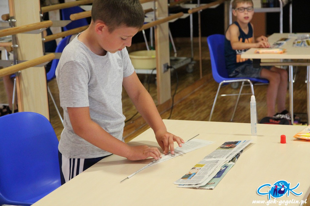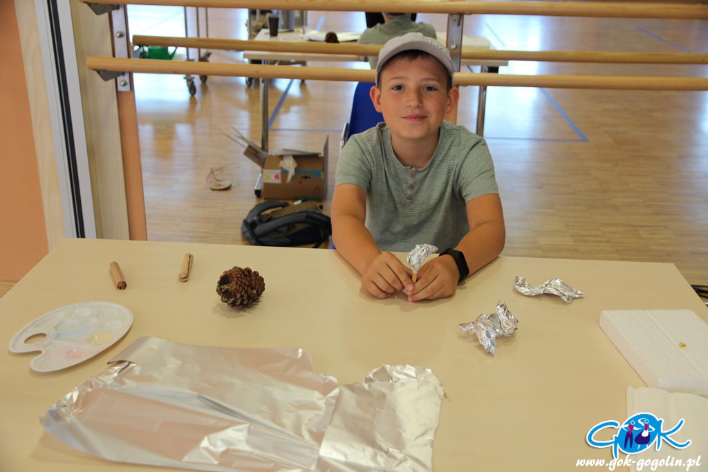 W kolejnym dniu wakacji w Gminnym Ośrodku Kultury w Gogolinie uczestnicy zajęć rozpoczęli pracę nad „flamingiem 3D”. Do wykonania stelażu potrzebna jest folia aluminiowa, drewniane patyczki oraz masa papierowa. Gotowa konstrukcja musi dokładnie wyschnąć, aby w kolejnym kroku nałożyć odpowiednią farbę. Jutro druga część pracy, czyli sklejenie elementów z szyszką. Efekty już dziś przeszły najśmielsze oczekiwania!