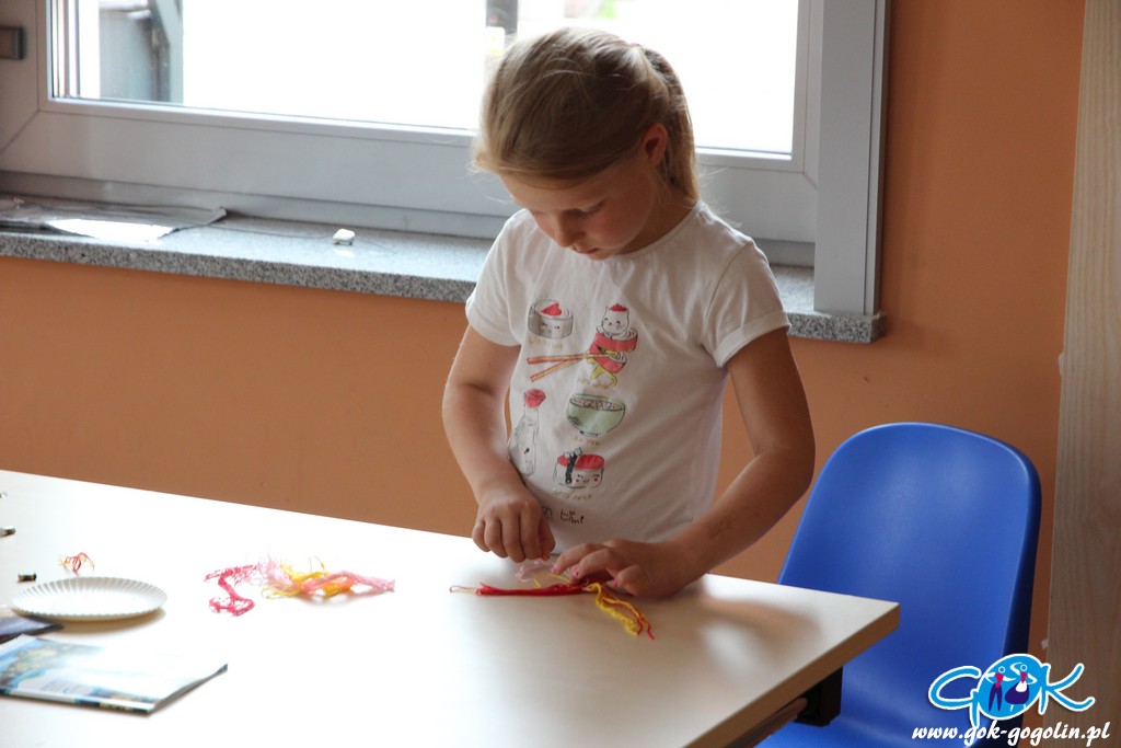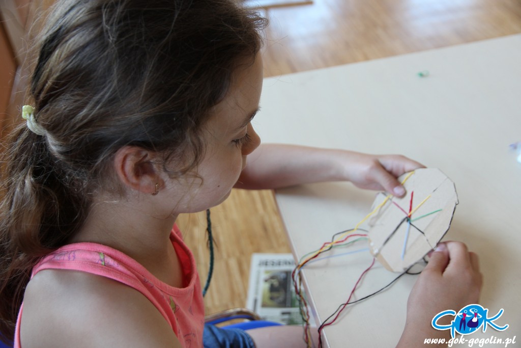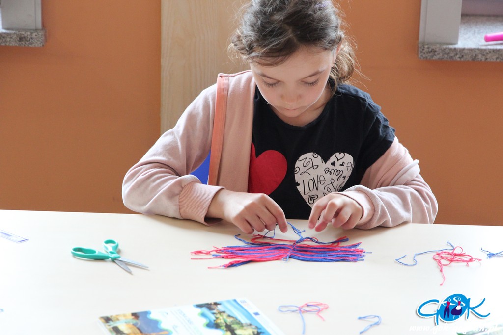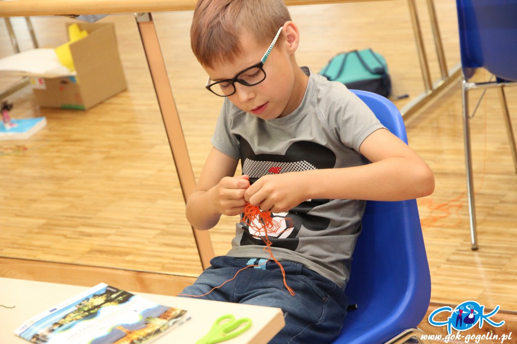 Druga część warsztatów była poświęcona makramie. Dzieci nauczyły się sztuki wyplatania sznurkiem. Stworzyły własnoręcznie pióra, które użyły do breloczków lub wykorzystają w przyszłym tygodniu do tzw. „łapaczy snów”.