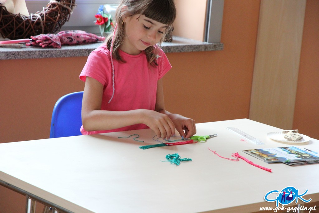 Po chwili odpoczynku na świeżym powietrzu, dzieci miały okazję wykonać bransoletki z kolorowej muliny. To była bardzo czasochłonna praca, ale warto było poczekać na efekt końcowy.