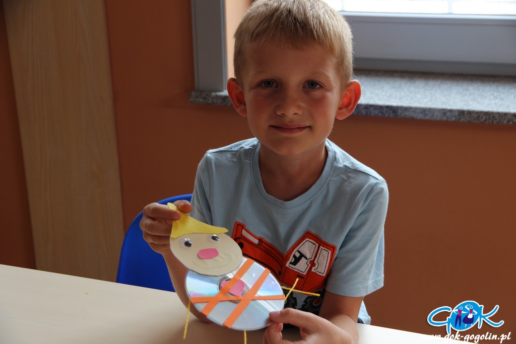 Podczas czwartkowych zajęć w Gminnym Centrum Kultury w Gogolinie dzieci wykonały kolorowe krasnoludki. Do ich wykonania potrzebny jest: filc, płyta CD, kolorowy papier, włóczka, ruchome oczka oraz koraliki. Gotowy skrzat może posłużyć, jako ozdoba do domu i ogrodu.