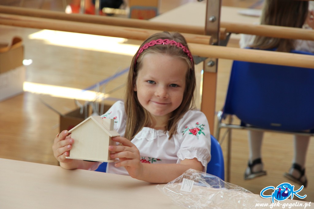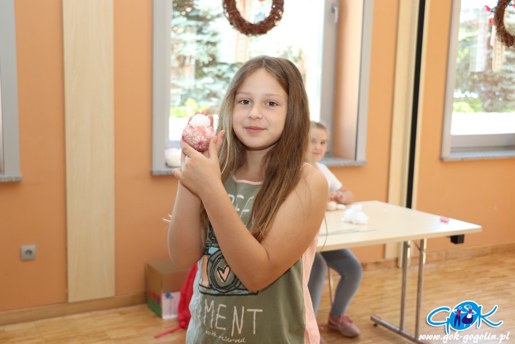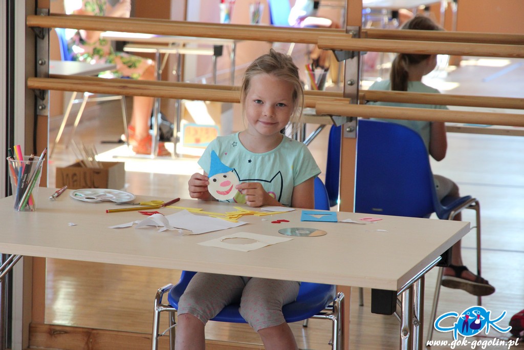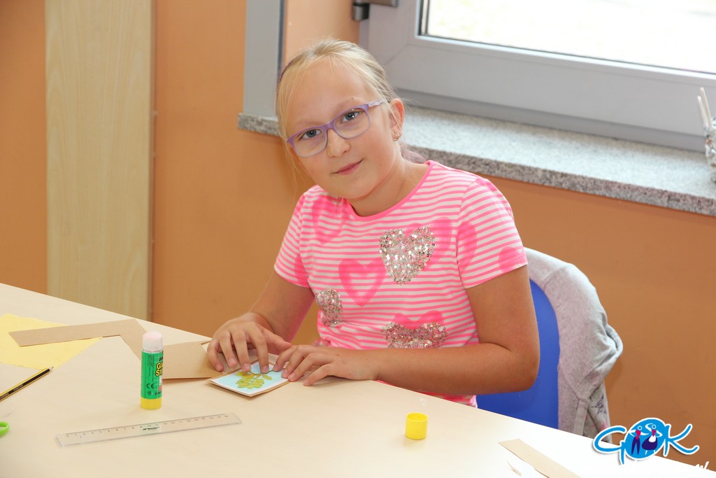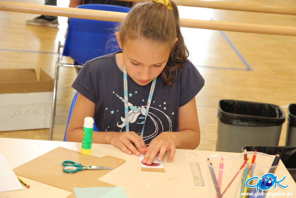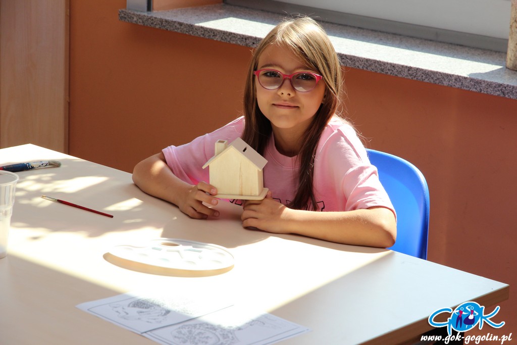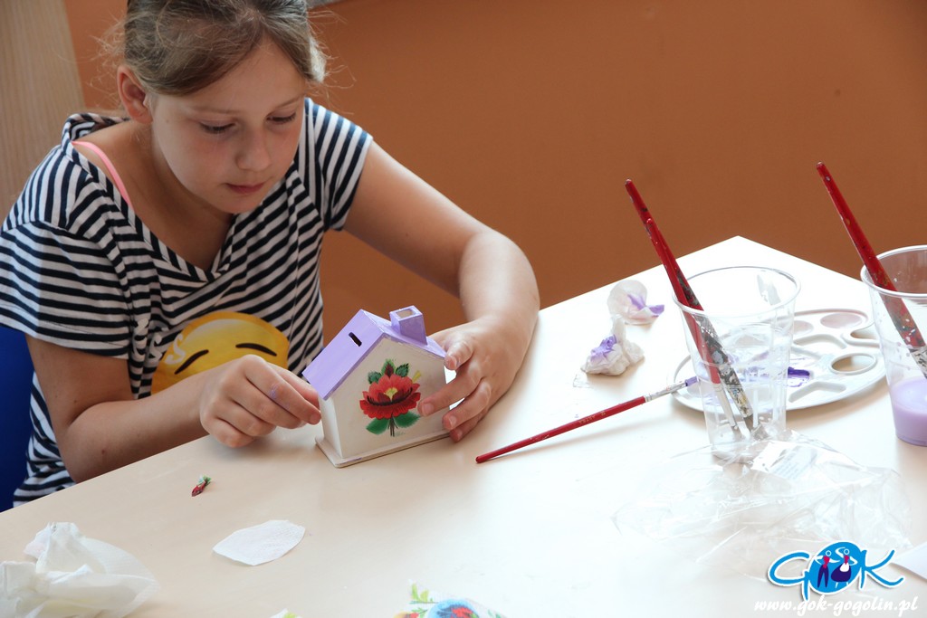Ostatniego dnia zajęć wakacyjnych w Gminnym Centrum Kultury w Gogolinie uczestnicy zajęć zdobili drewniane skarbonki techniką decoupage polegającą na przyklejaniu na powierzchnię wzoru wyciętego z serwetki papierowej. Był też również czas na dokończenie swoich wcześniejszych prac. Nie zabrakło także spaceru na świeżym powietrzu. Na zakończenie zajęć każdy otrzymał pamiątkowe zdjęcie.