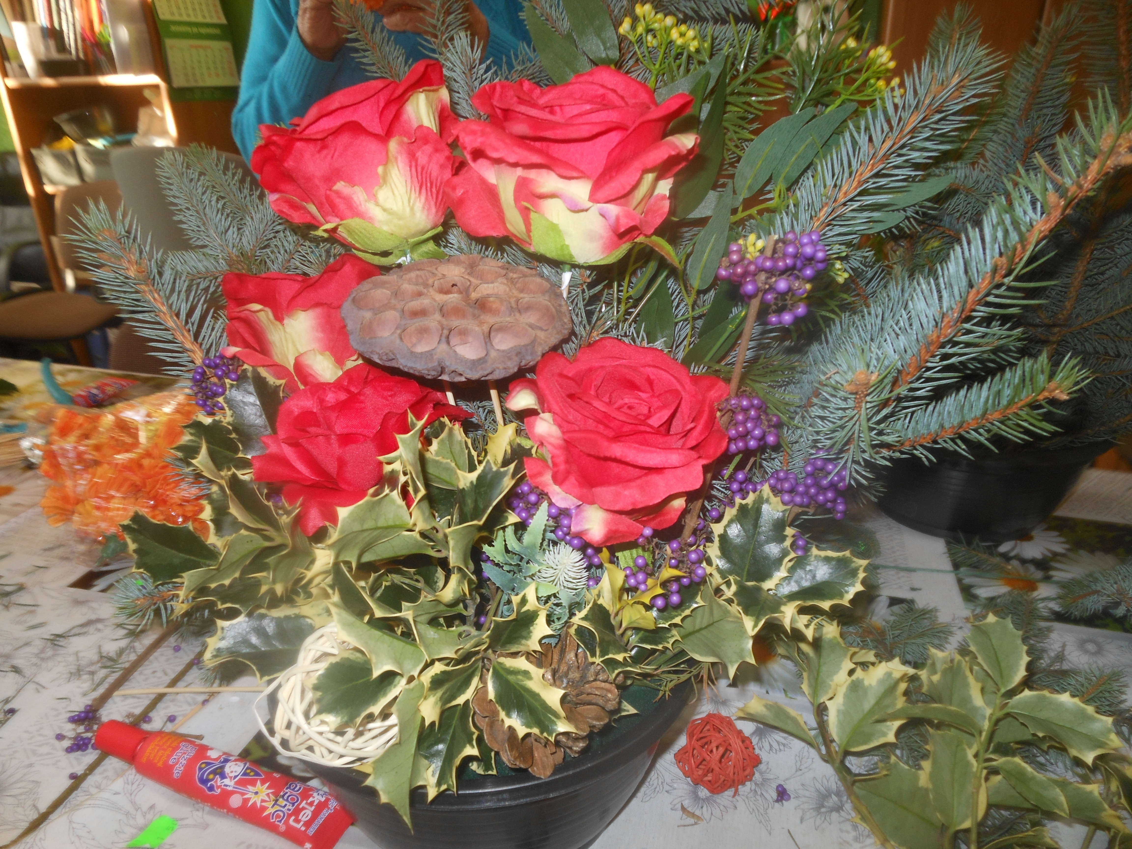 Do wykonania dekoracji wykorzystano gałązki jodły, ostrokrzew i sztuczne kwiaty, co zapewni ich trwałość i estetyczny wygląd przez dłuższy czas.