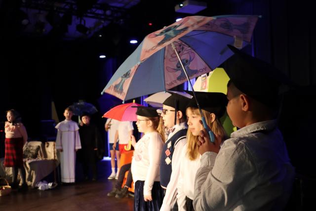 Na scenie rozbrzmiewały dźwięki śmiechu i radości, gdy dzieci wcieliły się w postaci z ulubionych bajek autora. Małpka Fiki-Miki, Panna z mokrą głową, Jacek i Placki czy też nieodzowny Koziołek Matołek ożyli na deskach teatru dzięki zaangażowaniu i talentowi młodych aktorów. Pan Łukasz Mandola, towarzyszący im na scenie, dodawał magii grzejąc na instrumentach i podkreślając emocje piosenkami. Główne role w muzycznym show przypadły uczniom z klasy 5b, Barbarze Gogolok oraz Michałowi Bocie. Ich występy porwały publiczność do tańca i śpiewu, przenosząc ich w świat barwnych przygód stworzonych przez Makuszyńskiego. 1 marca, Dzień Patrona Szkoły, stał się okazją do celebrowania twórczości pisarza i przywołania jego bohaterów na scenie. Humorystyczne dialogi, przemyślane sceny i wspaniale wykonane piosenki sprawiły, że zarówno młodzi, jak i starsi widzowie zostali wciągnięci w magię teatru. Nieodłączną częścią wydarzenia była również "Wędrująca Kapela", która swoją muzyką wprowadziła publiczność w jeszcze większy nastrój. Wspólnie z dziećmi wykonali znane i lubiane utwory, dodając jeszcze więcej energii i radości do atmosfery. Po zakończeniu spektaklu publiczność gorąco oklaskiwała młodych aktorów, doceniając ich talent oraz wysiłek włożony w przygotowanie przedstawienia. To wyjątkowe wydarzenie nie tylko bawiło i wprawiało w dobry nastrój, ale również oddawało hołd literaturze dziecięcej i twórczości Kornela Makuszyńskiego, który wciąż bawi i uczy kolejne pokolenia.