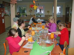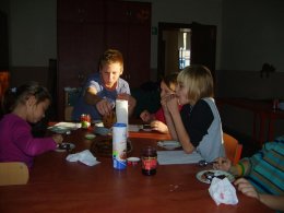 Ubiegła środa (tzn. 31 października) mogła być powodem do tego, aby po wizycie w naszej świetlicy DYNIA zaczęła śnić się po nocach. Cudownie pomarańczowe dynie zawitały w naszej Świetlicy nie po to, aby świętować Helloween. Atrakcją główną tego popołudnia było przygotowywanie PLACKÓW Z DYNI, lecz co do ich smaku nie byliśmy przekonani. Jakimś dziwnym trafem większość z nas nie gustowała do dnia dzisiejszego w „dyniowych smakach". Najpierw trzeba było wszystko przygotować: dynię obraliśmy, potarliśmy, dodaliśmy resztę produktów i rozpoczęło się wielkie smażenie. Chętnych do tych prac na szczęście nie brakowało, a każdy z nas czekał z niecierpliwością na rezultaty. Początkowo nie byliśmy przekonani co do smaku owych placków, lecz rozchodzący się zapach z kuchni zachęcał do skosztowania tego, co sporządziliśmy własnymi rękoma. Wystarczyło spróbować jednego małego placuszka i jakie rezultaty??? PUSTA MISKA PLACKOWA Do tego zapijaliśmy pyszny kompocik dyniowo – jabłkowy. Zapach placków z dyni rozchodził się chyba po całym Kamieniu Śląskim... W międzyczasie stworzyliśmy piękne dynie z plastikowych butelek. Pomysłowe wykonanie jak zwykle wielce nas zaskoczyło. Wszystkie dzieci dyniowe prace wykonały pięknie i zachęcamy inne dzieci i młodzież do uczęszczania do naszej świetlicy. Jednakże najbardziej cieszyliśmy się z tego, że mogliśmy usiąść razem przy posiłku. Dzień dyni był dla nas pełen uśmiechu i radości. Z niecierpliwością będziemy czekać na inne niecodzienne wydarzenia w naszej świetlicy. Przesiąknięci zapachem placków z dyni udaliśmy się do swoich domów z przekonaniem, że niezwykle zdrową naszą pomarańczową DYNIĘ można naprawdę smakowicie przyrządzić...