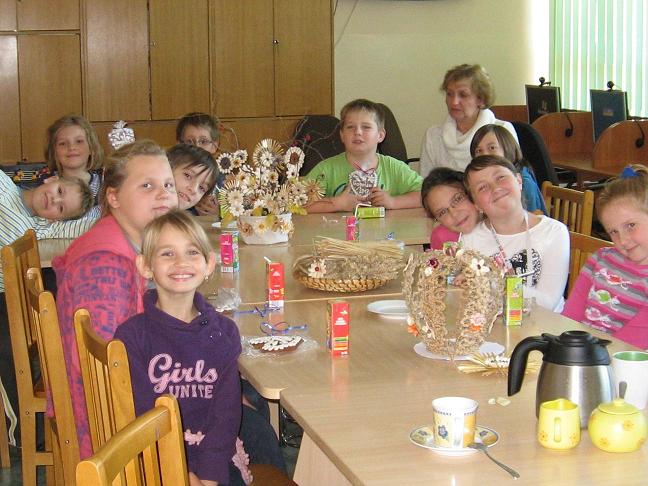 W dniu dzisiejszym tj. 04.10.2013 gościliśmy w naszej świetlicy klasę III, na zajeciach z sztuki i kultury ludowej. Tematem naszych zajęć były "Dożynki, Żniwniok, Podziękowanie za żniwo .....". W pierwszej części zajęć dzieci poznały sposoby wykonywania korony żniwnej, dowiedziały się o ich rodzajach i przeznaczeniu. Druga część zajęć miała charakter czysto kulinarny tzn. polegała na przygotowaniu i skonsumowaniu ciasta "podożynkowego". Dzieci wykazywały wielkie zainteresowanie naszymi pięknymi tradycjami. Całe spotkanie przebiegło w bardzo miłej i serdecznej atmosferze.