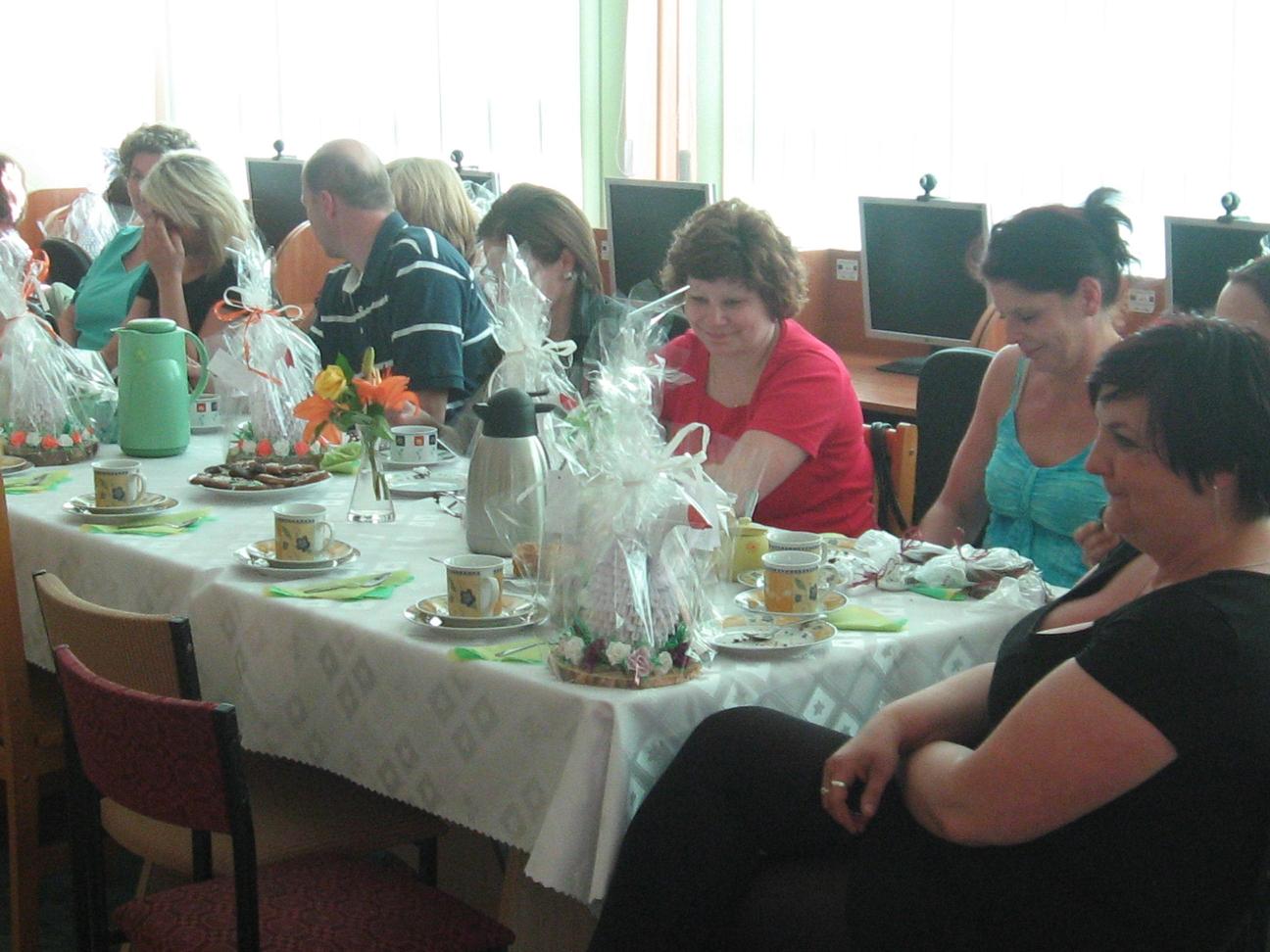 Było kilka powodów aby zaprosić rodziców do naszej świetlicy. M. in. były to: Dzień Matki i Ojca oraz zakończenie roku szkolnego, a co się ściśle z tym wiąże - rozpoczęcie wakacji. Wszystkim nam zależy aby były one udane, ciekawe, pełne niespodzianek no i bezpieczne dla wszystkich. Do tego dnia bardzo długo się przygotowywaliśmy. Każdy z rodziców otrzymał prezent - stroik, który wymagał dużo pracy i zaangażowania dzieci. Były to łabędzie (do wykonania każdego potrzeba 400 szt. zwiniętych odpowiednio karteczek) w wianku z róż z krepiny. Starsze dziewczyny pięknie je zapakowały i ozdobiły. Przy kawie i upieczonym przez dzieci cieście bardzo przyjemnie i miło upłynęło popołudnie. Spotkanie uświetniły swoim występem "Aksamitki", które pod kierunkiem pani Ewy Wawrzynek przygotowały przepiękny i wzruszający program. Do występów dołączyły oczywiście wszystkie przybyłe dzieci. Było nas bardzo dużo, musieliśmy skorzystać z gościnności szkoły aby pomieścić wszystkich naszych zacnych gości i dzieci.