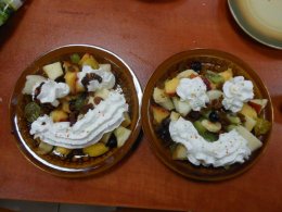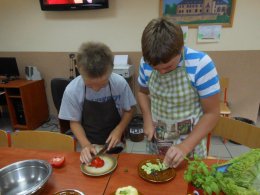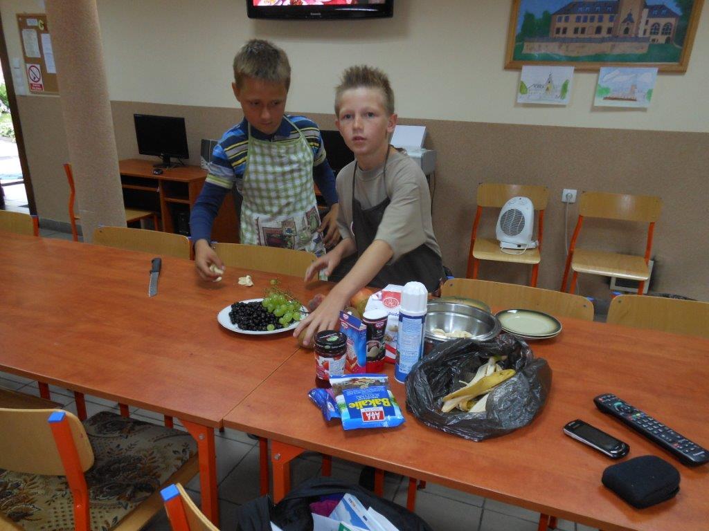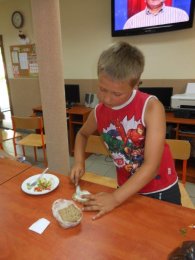 W drugim tygodniu wakacji w świetlicy w Kamieniu Śląskim odbył się tydzień kulinarny, w którym dzieci mogły przygotować wakacyjne gofry, kolorowe kanapki, sałatki owocowe i warzywne. Podczas przygotowywania wakacyjnych gofrów dzieci świetnie się bawiły, przygotowaliśmy ciasto i pokroiliśmy owoce. Każdy z nas po upieczeniu gofra ozdabiał go na swój sposób, owocami, bakaliami, bitą śmietanę, sosem czekoladowym oraz innymi słodkimi dodatkami. Owocowe sałatki również miały swój niepowtarzalny smak i wygląd. Do warzywnych sałatek i kolorowych kanapek dodaliśmy zioła z naszego kącika przyrodniczego między innymi bazylie, oregano, mięte. Naszymi sałatkami i kanapkami podzieliliśmy się z Paniami i księdzem, którzy mieli spotkanie w salce parafialnej, wszyscy byli zachwyceni naszą pomysłowością.