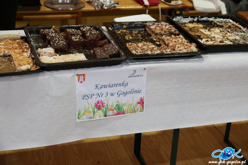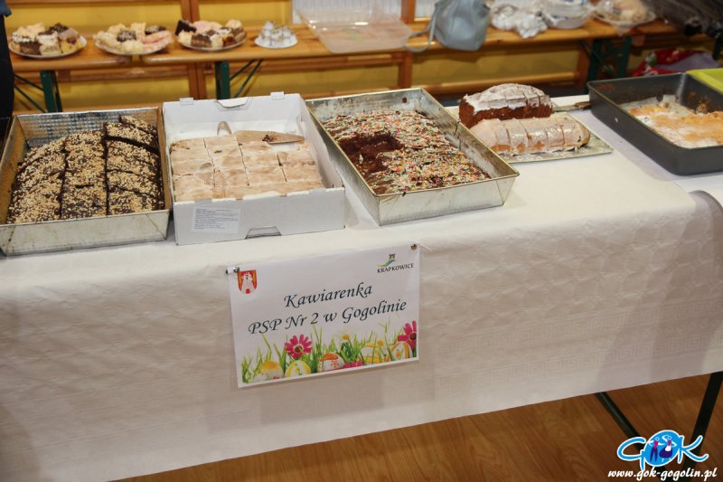 W sobotę ogromnym zainteresowaniem cieszyły się potrawy biorące udział w Konkursie na Najciekawszy Stół Wielkanocny, przygotowane przez sołectwa, dzielnice, stowarzyszenia, biblioteki, świetlice, szkoły i przedszkola Gminy Gogolin. Na przystrojonych stoiskach zawitały: baby, babeczki, mazurki, baranki i zające z ciasta, ciasteczka, serniki, jaja przyrządzone na różne sposoby, żurek wielkanocny, warzywa w galarecie.