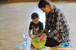 Ostatnie zajęcia w kwietniu miały na celu budowania relacji z dziećmi poprzez zabawy oparte na dotyku, masażyki bazujące na naturalnej aktywności dzieci według Profesor Marty Bogdanowicz. Nie mogło zabraknąć ulubionych zabaw z chustą animacyjną oraz toru przeszkód. Dodatkowo wykonana została praca z masą solną, która uczestnicy musieli samodzielnie wykonać.