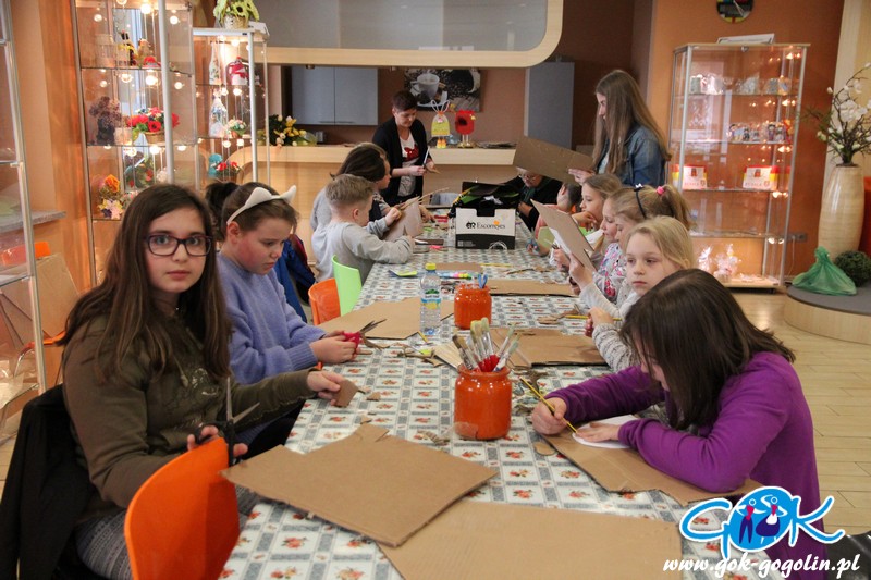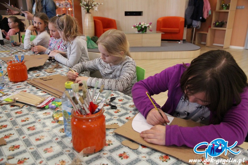 Poprzez odpowiednio wyciętą i pomalowaną tekturę powstał tułów naszego zwierzątka. Całość wykończono ozdobami: guzikami, wstążkami, koronką. Domalowano także wąsy i oczka, doklejono pompony i przymocowano uszy z drucików kreatywnych. Całość wyszła bardzo ciekawie! Największym zaskoczeniem były jednak buty naszego zajączka, które powstały z tektury, jajka niespodzianki oraz filcu. Ten sposób na pewno wykorzystamy jeszcze w niejednej pracy. Na zajęciach powstały także inne dekoracje: był kogucik oraz ozdoba wielkanocna z uszytym z filcu zajączkiem.