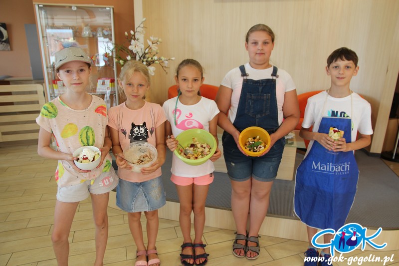 We wtorek 02.07.2019 r. - drugiego dnia wakacji, dzięki uprzejmości rodziców, w czasie zajęć kulinarnych, uczestnicy wykonali pyszne i zdrowe sałatki owocowe. Dodatkowo powstał kolorowy jeż: z arbuza oraz nabitych na patyczek owoców. Było pysznie! Tego dnia dzieci złożyły także papierowe łódki, a następnie odbył się wyścig – która najszybciej przekroczy metę.