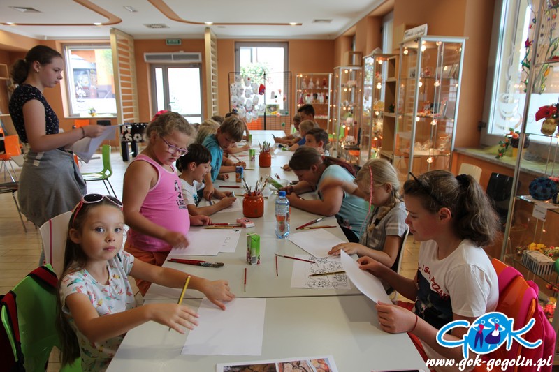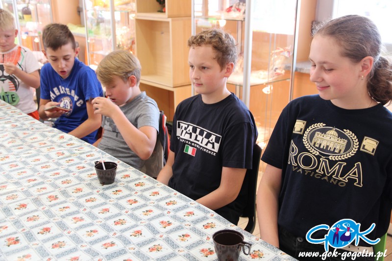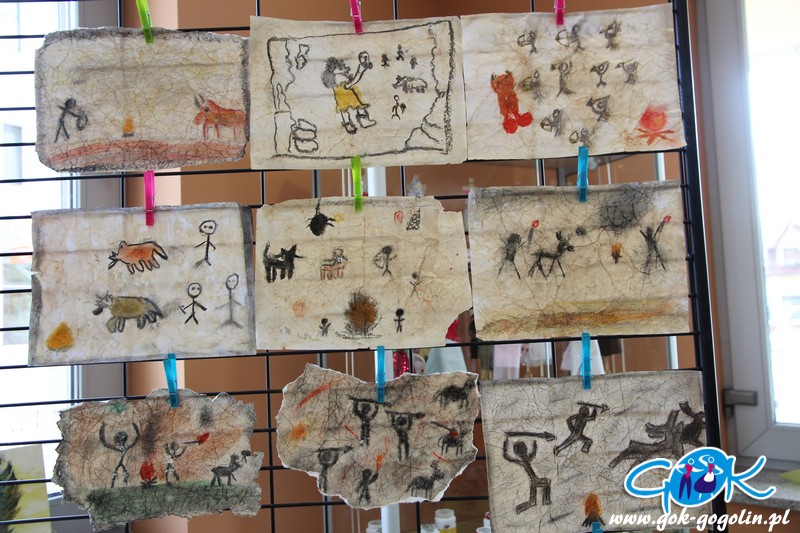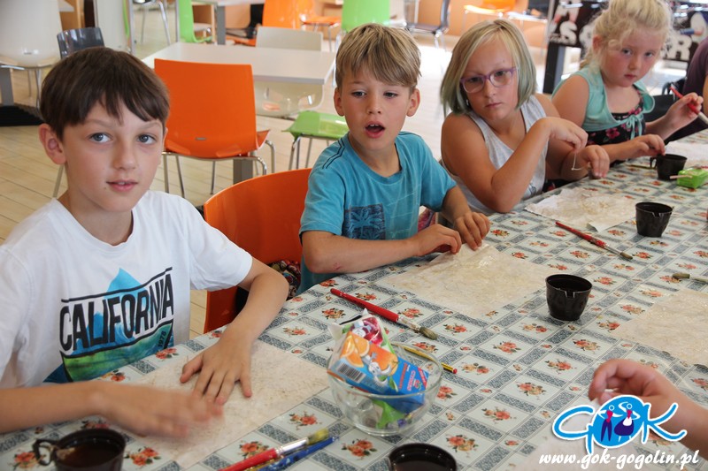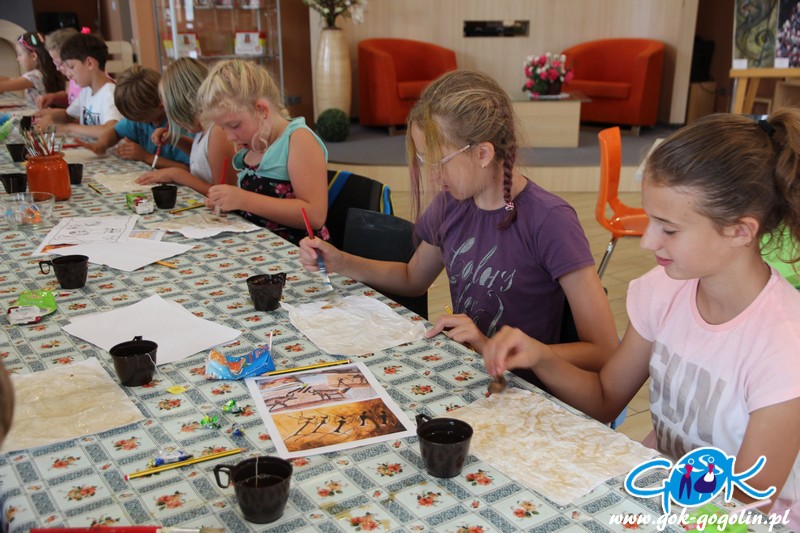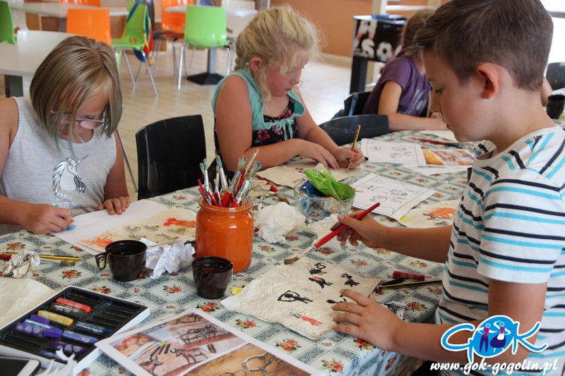 W poniedziałek 22.07.2019 r. uczestnicy zajęć wzięli udział w warsztatach malowania herbatą, w czasie których poznali czym jest malarstwo naskalne, jaskiniowe. Do wykonania pracy wykorzystano suche pastele oraz węgiel rysunkowy.