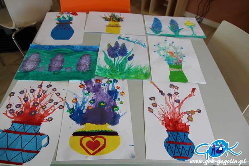 Zajęcia plastyczne w tym tygodniu poprowadziła Emilia Mandok, która jest jedną z wolontariuszek w Nutka Cafe. W pracach wykorzystano metodę rozdmuchiwania farby słomką oraz stemplowania. Powstały kolorowe wazony oraz kwiaty lawendy.