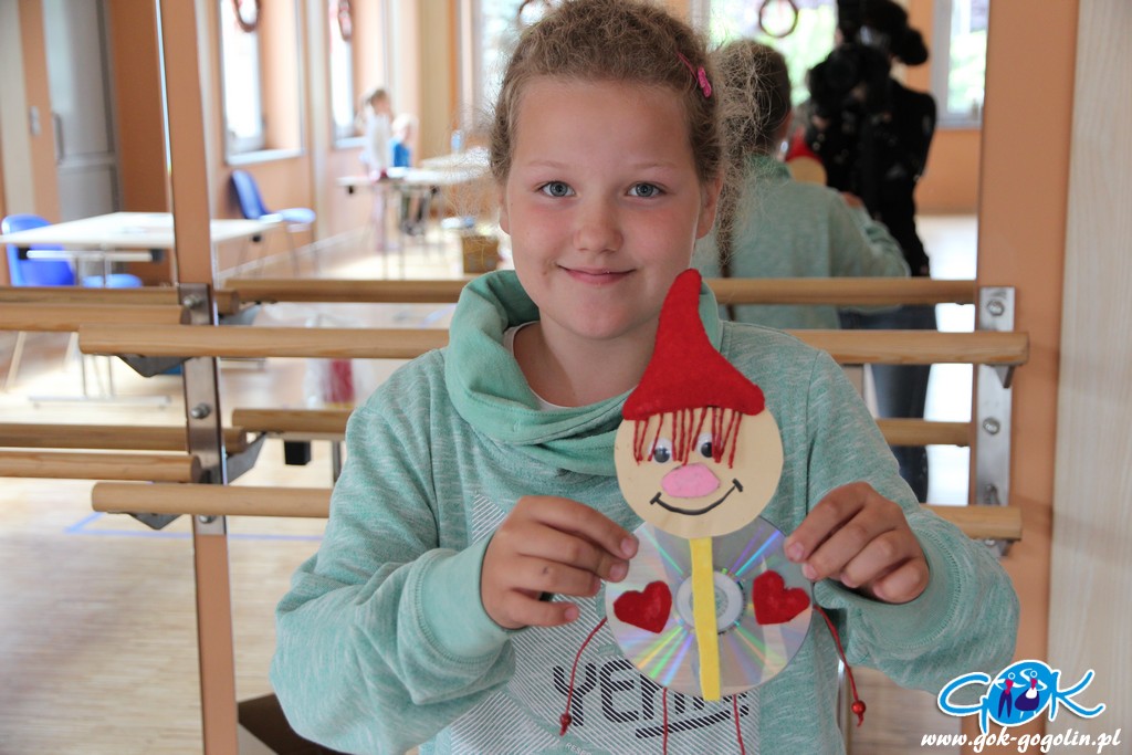 Podczas czwartkowych zajęć w Gminnym Centrum Kultury w Gogolinie dzieci wykonały kolorowe krasnoludki. Do ich wykonania potrzebny jest: filc, płyta CD, kolorowy papier, włóczka, ruchome oczka oraz koraliki. Gotowy skrzat może posłużyć, jako ozdoba do domu i ogrodu.