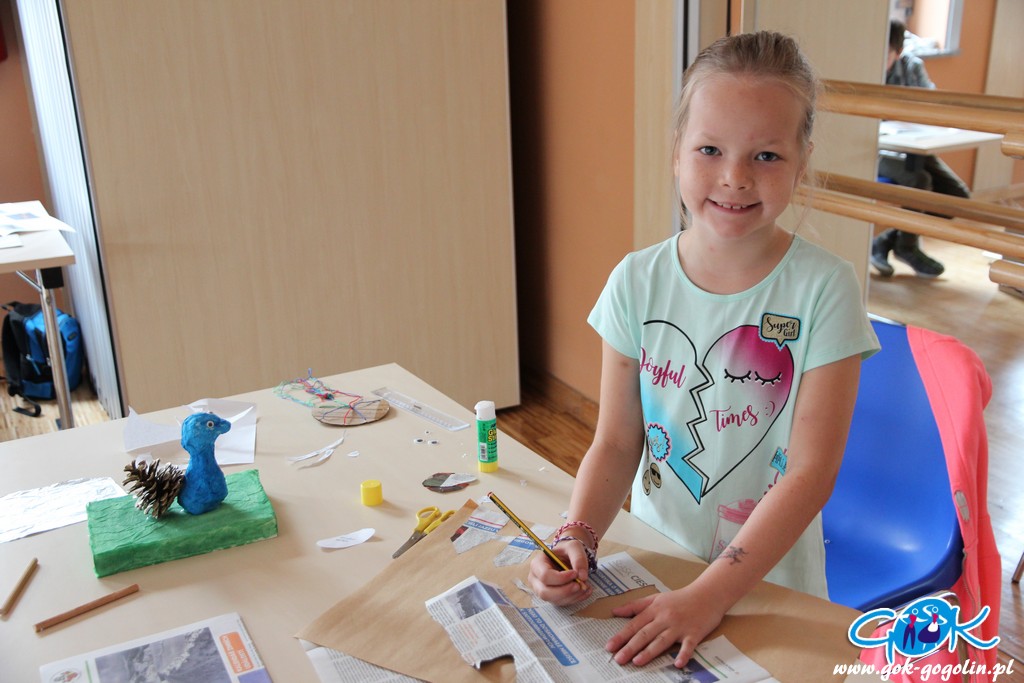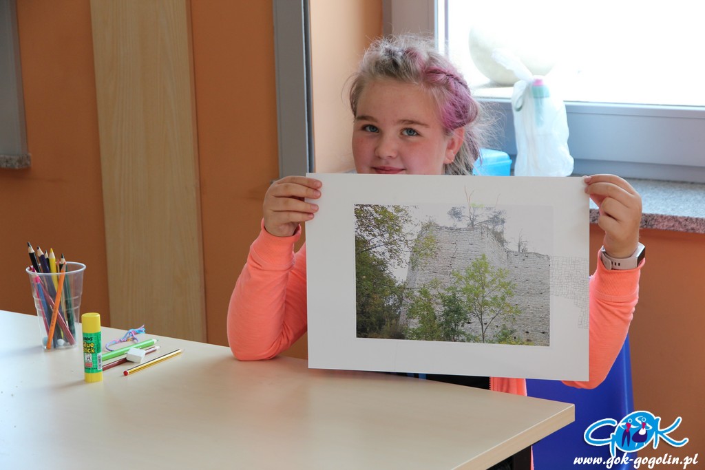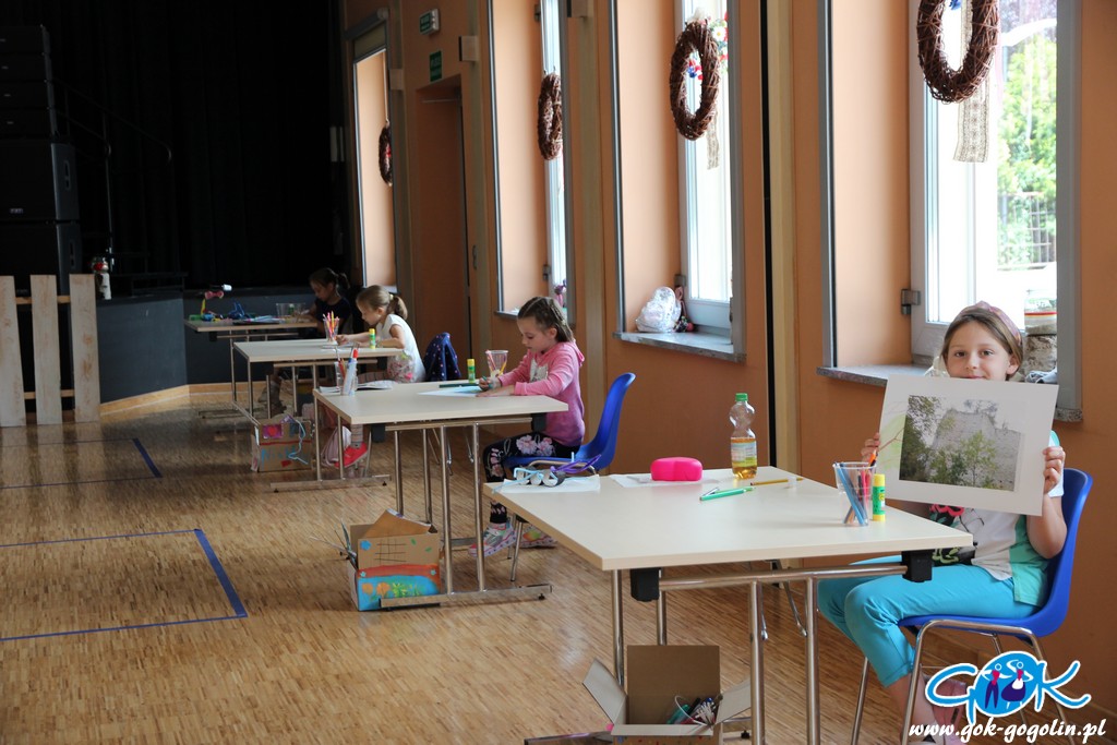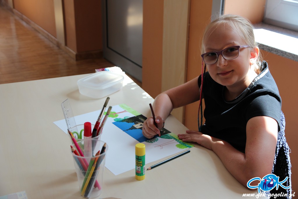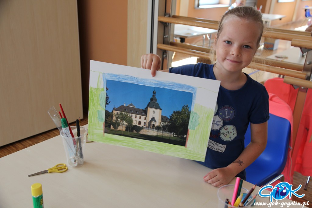 Piątkowe zajęcia w Gminnym Centrum Kultury poświęcone były turystyce lokalnej. Pani Ewa z Informacji Turystycznej w Gogolinie przygotowała szereg materiałów, dzięki którym dzieci zapoznały się z lokalnymi atrakcjami turystycznymi, a także poznały historię regionu oraz miejscowe legendy. Był film promujący Gminę Gogolin, a także praca plastyczna. Na kartkę formatu A3 przyklejono zdjęcie miejscach charakterystycznego dla miejscowości Gminy Gogolin. Zadaniem każdego uczestnika było „domalowanie” pozostałych elementów tak, aby obraz był jak najbardziej rzeczywisty. Zajęcia zakończyła zabawa w karaoke.
