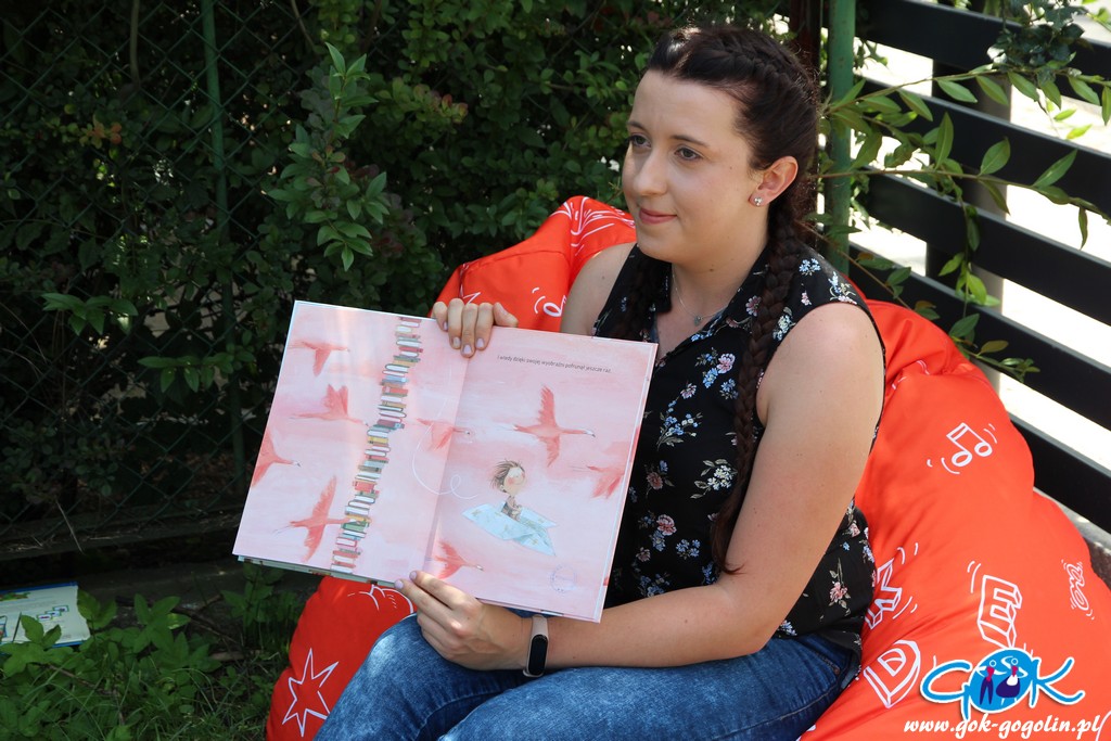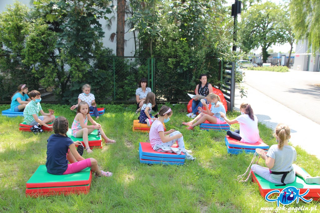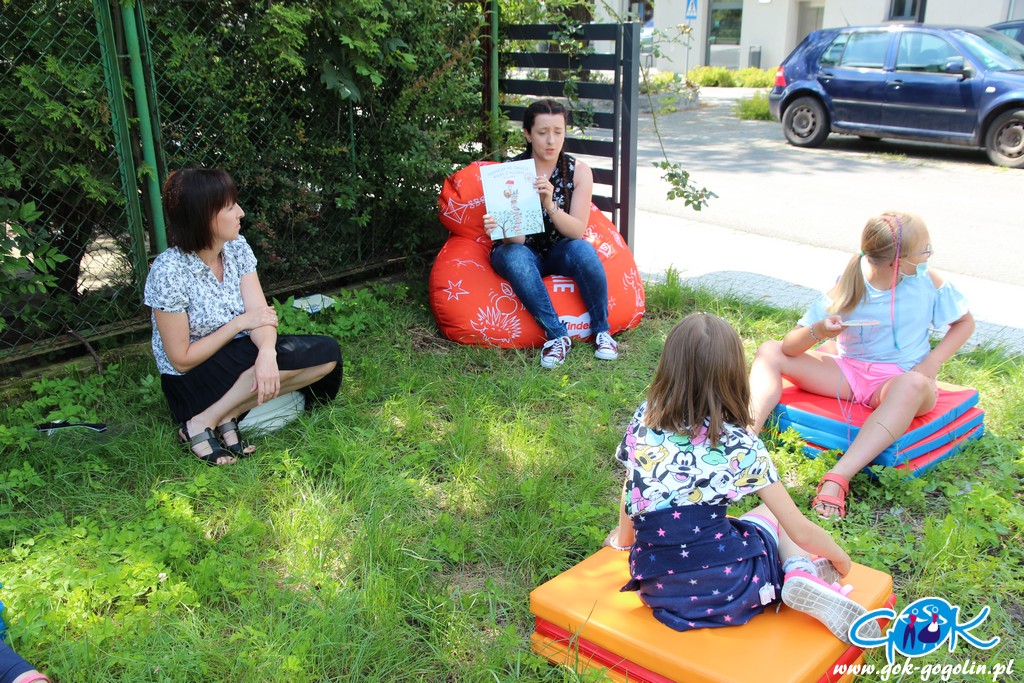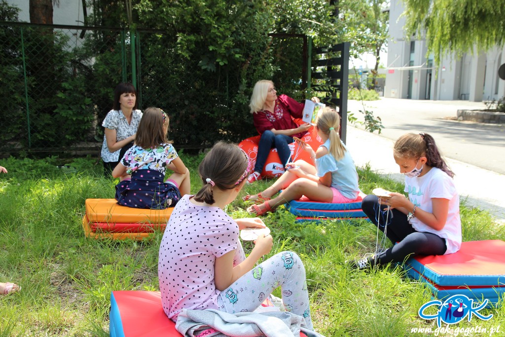 W przerwie na świeżym powietrzu, przy Gminnej Bibliotece Publicznej w Gogolinie, dokończono nasze bransoletki. Dzieciom tak przypadły do gustu, że niektórzy zrobili już kilka. Podczas czytania na trawie wysłuchano książek „Franklin na wycieczce” oraz „Najwyższa na świecie wieża z książek”.