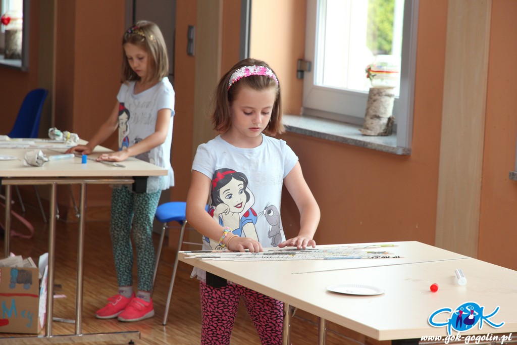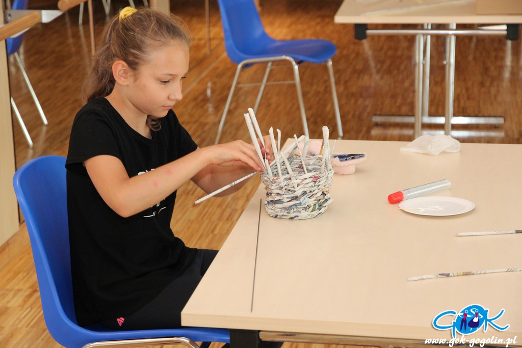 Podczas kolejnych zajęć (21.07.2020 r.) w Gminnym Centrum Kultury w Gogolinie, dzieci tworzyły koszyki z papierowej wikliny. Jest to ekologiczny materiał DIY („zrób to sam”), który stanowi doskonały sposób na spożytkowanie makulatury – zwłaszcza niepotrzebnych już gazet.
