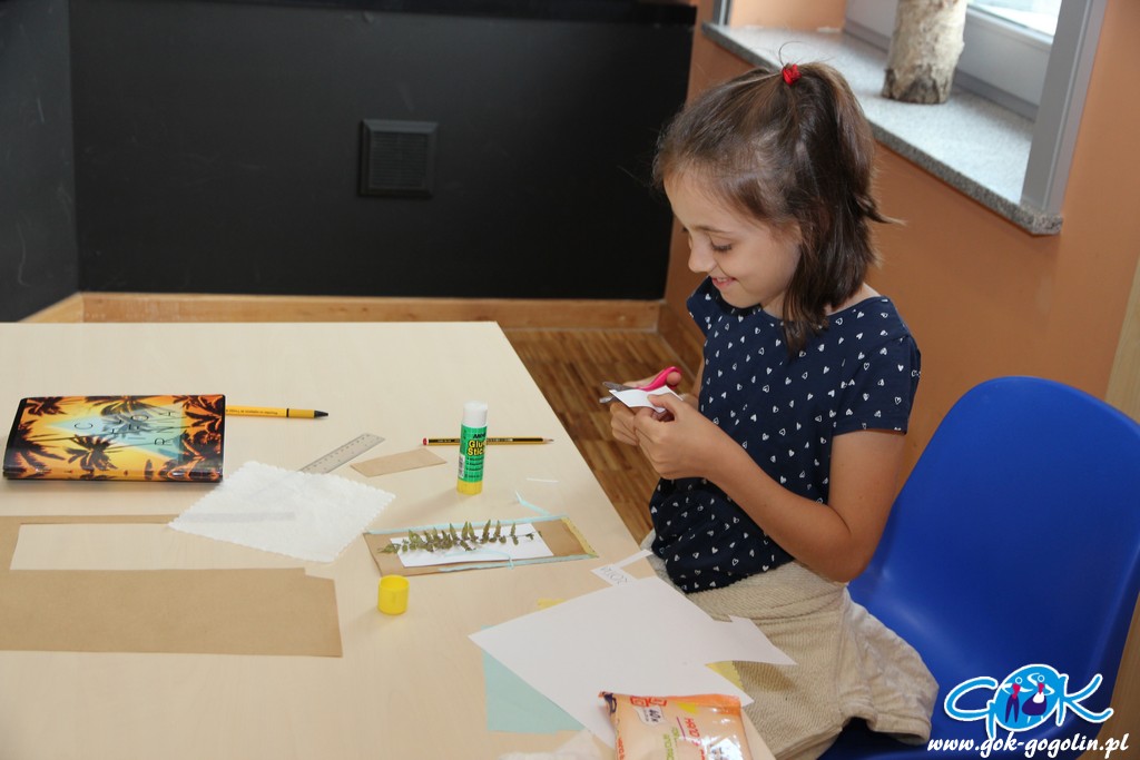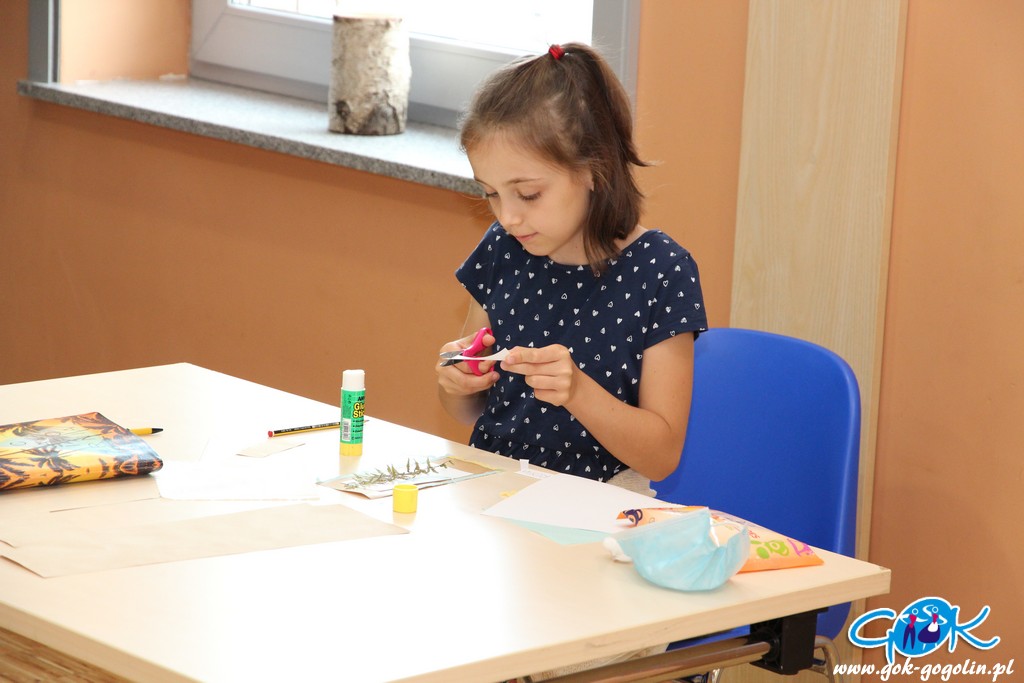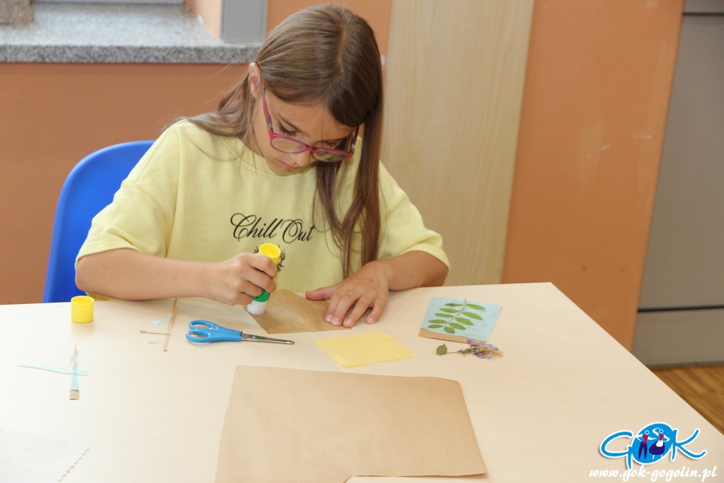 Podczas czwartkowych zajęć w Gminnym Centrum Kultury w Gogolinie dzieci próbowały „zatrzymać lato”. Przygotowane wcześniej zasuszone kwiaty i liście zostały wykorzystane do zrobienia przepięknych obrazków oraz zakładek do książek.