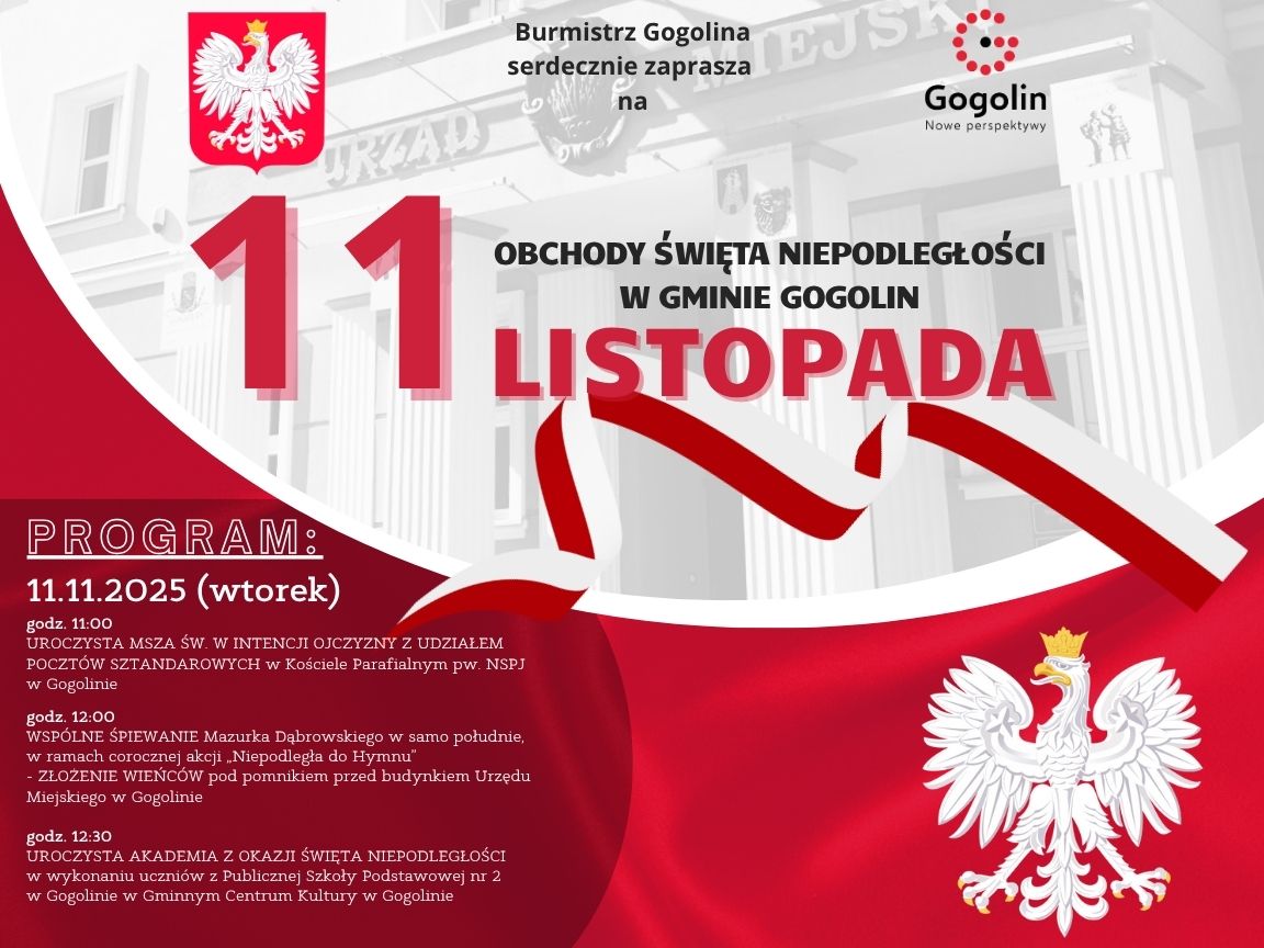 Burmistrz Gogolina Krzysztof Reinert n zaprasza wszystkich mieszkańców do wspólnego uczczenia 107. rocznicy odzyskania przez Polskę niepodległości. Uroczystości odbędą się 11 listopada 2025 roku (wtorek) i będą okazją do wspólnego świętowania oraz wyrażenia szacunku dla historii i tradycji narodowych.