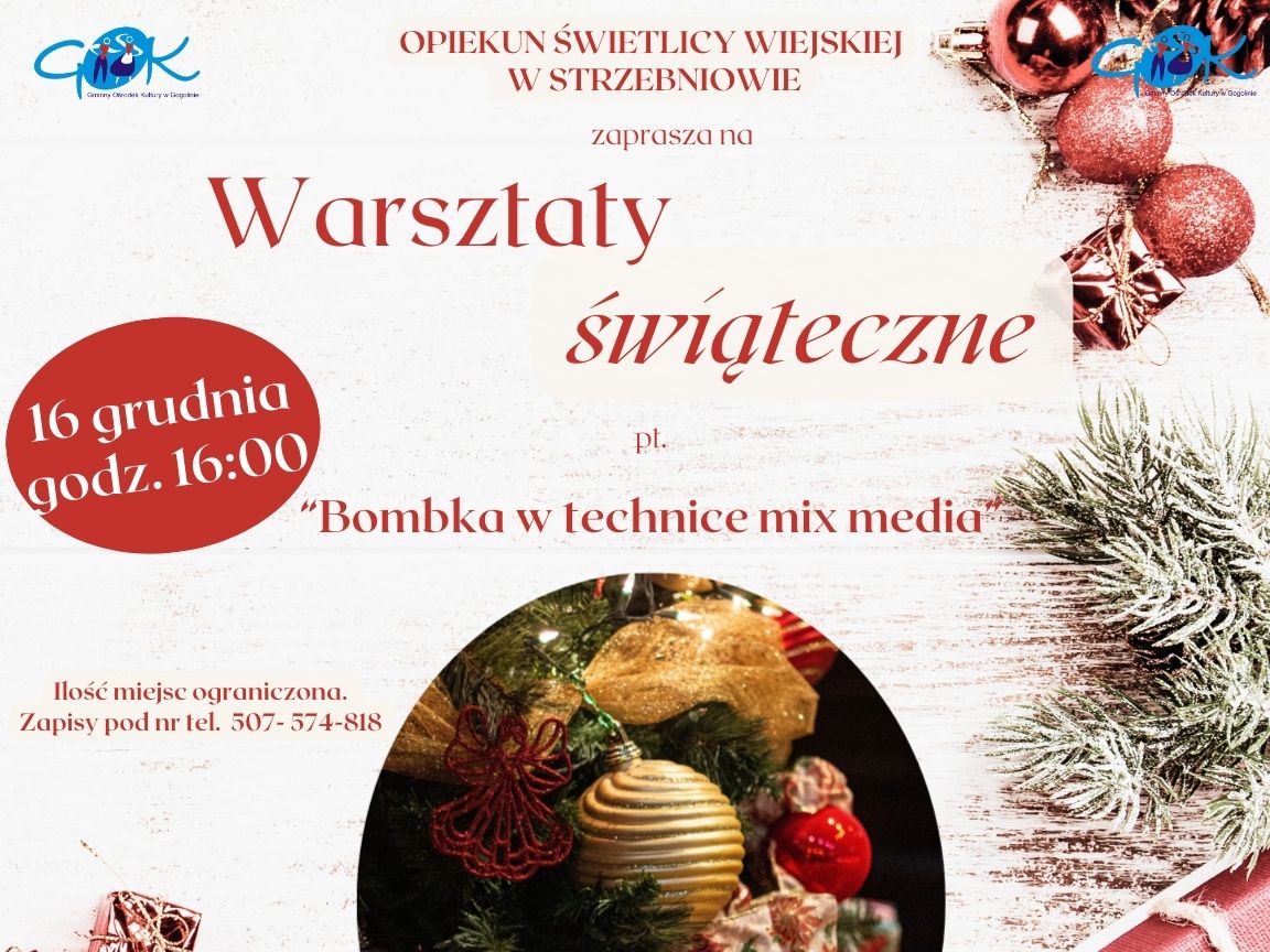 Gminny Ośrodek Kultury w Gogolinie zaprasza mieszkańców na Warsztaty Świąteczne, które odbędą się w świetlicy wiejskiej w Strzebniowie. Spotkanie będzie okazją do twórczego przygotowania się do nadchodzących Świąt Bożego Narodzenia oraz poznania techniki mixed media w praktyce.
