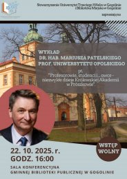 W dniu 22 października 2025 roku odbyło się spotkanie wykładowe z dr. hab. Mariuszem Patelskim, profesorem Uniwersytetu Opolskiego. Prelegent przedstawił temat „Profesorowie, studenci i… owce – niezwykłe dzieje Królewskiej Akademii w Prószkowie”.