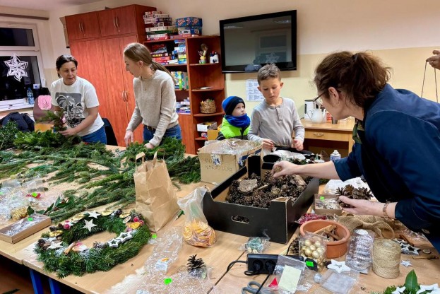W piątkowe popołudnie, 28 listopada 2025 roku, w Świetlicy Wiejskiej w Kamionku odbyły się warsztaty kreatywne o tematyce świątecznej, prowadzone przez opiekuna świetlicy. Uczestnicy zajęć mieli możliwość własnoręcznego wykonania wieńców adwentowych oraz świątecznych dekoracji na drzwi.