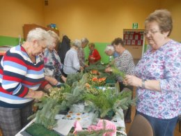 Materiały do stworzenia dekoracji, w tym gałązki świerku, zostały podarowane przez pana Konieczko, właściciela szkółki ogrodniczej w Górażdżach. Dzięki jego wsparciu seniorki mogły stworzyć piękne i naturalne kompozycje, które upiększą miejsca pamięci ich bliskich. Spotkanie było okazją do wspólnego spędzenia czasu, dzielenia się wspomnieniami i twórczym wyrażeniem szacunku dla tych, którzy odeszli.