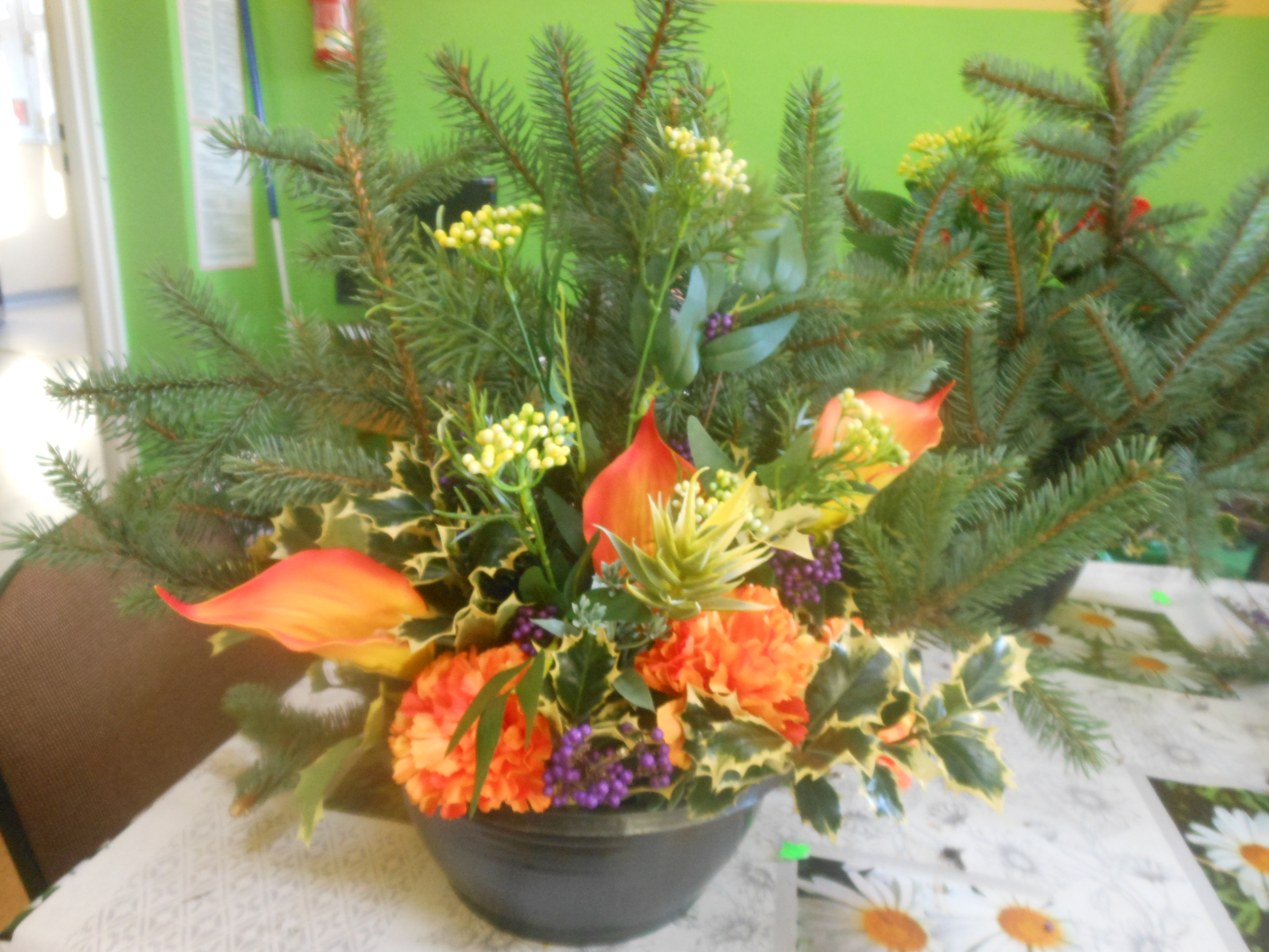 Do wykonania dekoracji wykorzystano gałązki jodły, ostrokrzew i sztuczne kwiaty, co zapewni ich trwałość i estetyczny wygląd przez dłuższy czas.