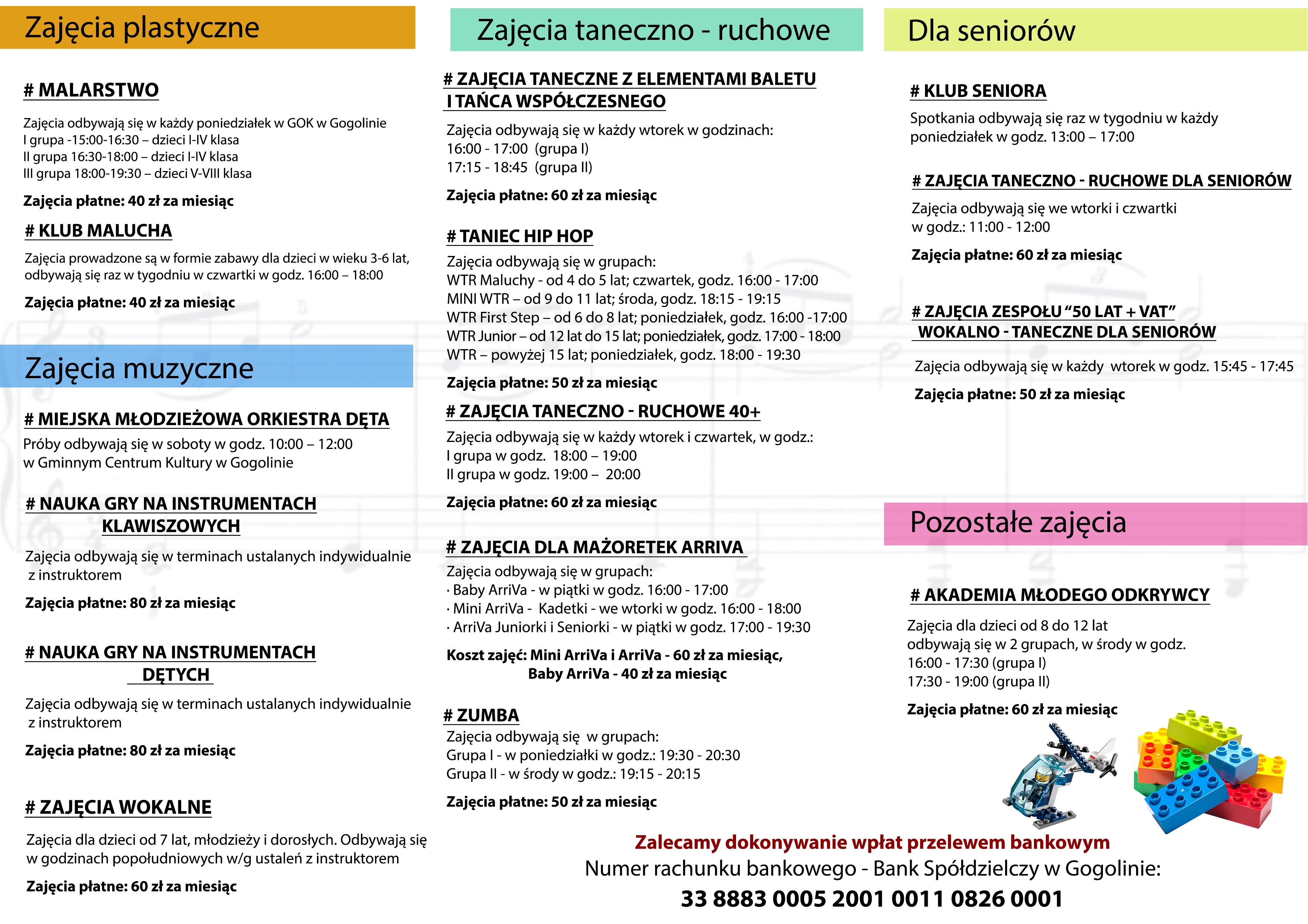 Więcej informacji na temat zajęć można uzyskać na stronie internetowej www.gok-gogolin.pl w zakładce ZAJĘCIA w GOK lub na facebooku.